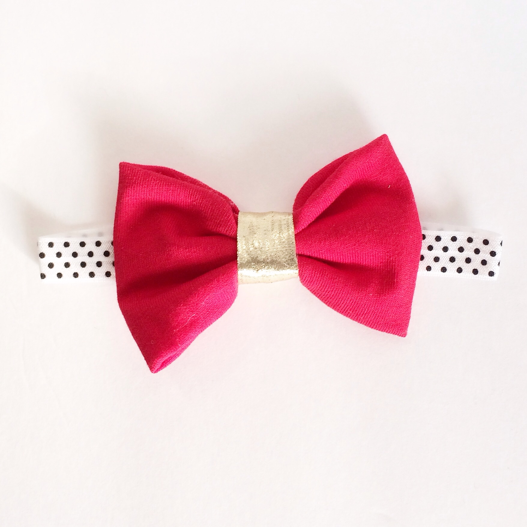 The bow measures approx. 4" long and comes attached to a 5/8" polka dot elastic headband.