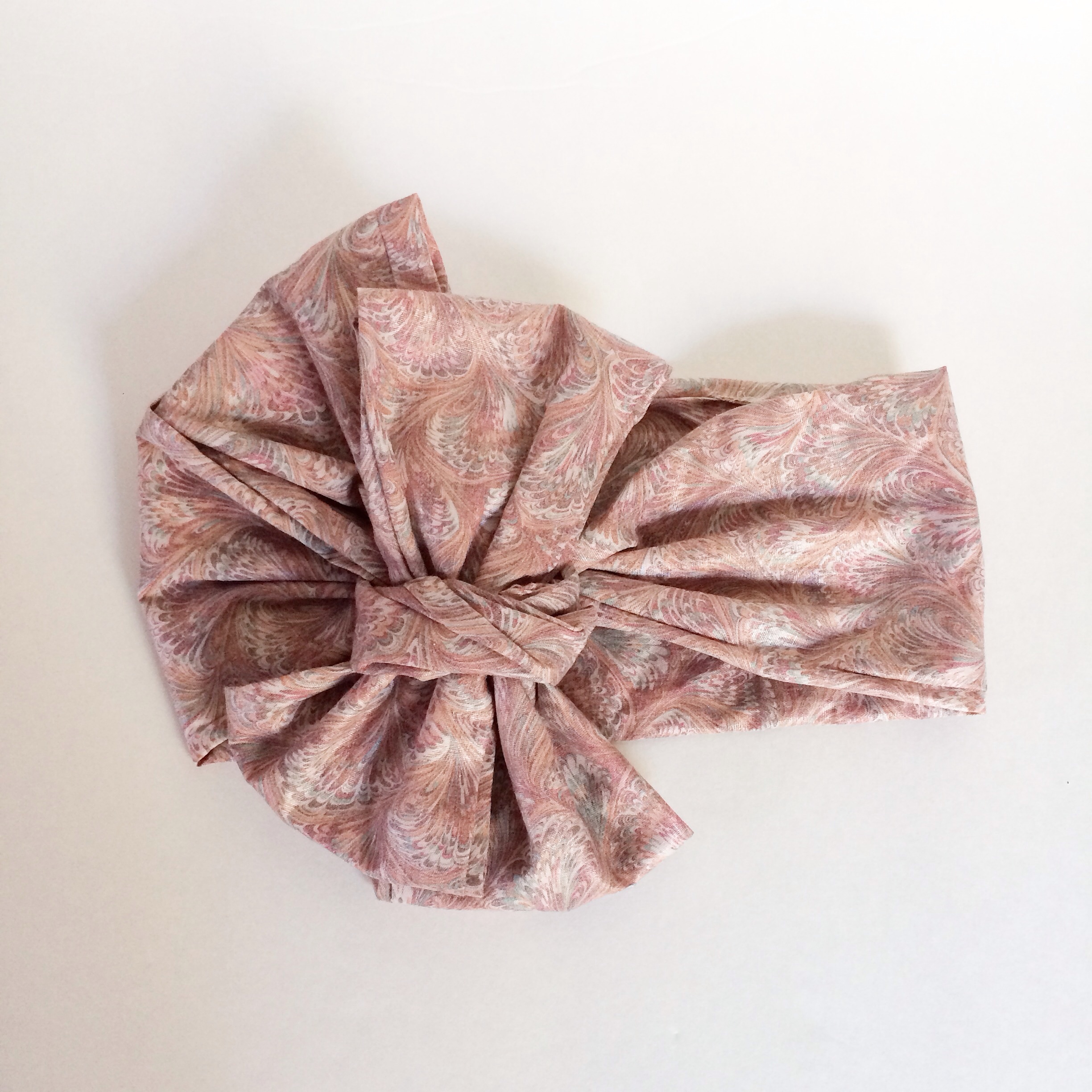 Handmade tie-on head wrap. One size fits all newborn-adult. Made with cotton blend fabric. Measures aprox. 52". Does NOT stretch.